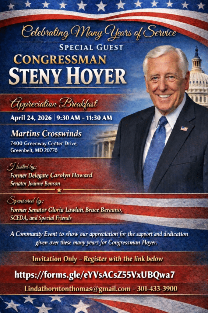 Honoring Congressman Steny H. Hoyer Celebrating a Lifetime of Leadership & Service It is our pleasure to celebrate the many accomplishments of a distinguished leader who began his legislative career in 1966 as a State Senator, and has faithfully served as Congressman for Maryland's 5th District since 1981. We honor his unwavering commitment to addressing the needs, concerns, and aspirations of the residents of Prince George's County and Maryland's District 5. In recognition of his years of dedicated service, the community has come together to host a special Appreciation Breakfast in his honor. ***INVITE ONLY***
